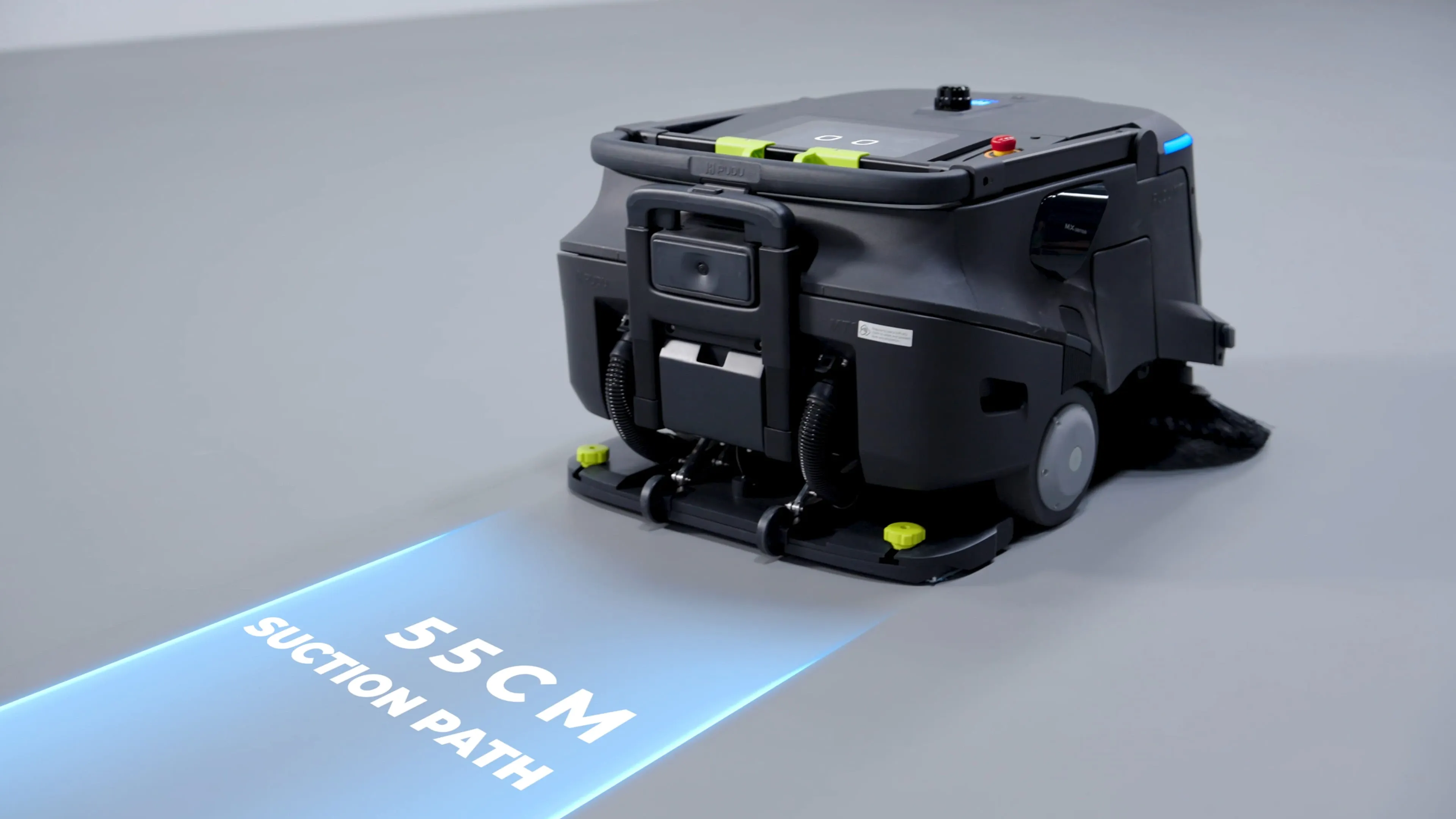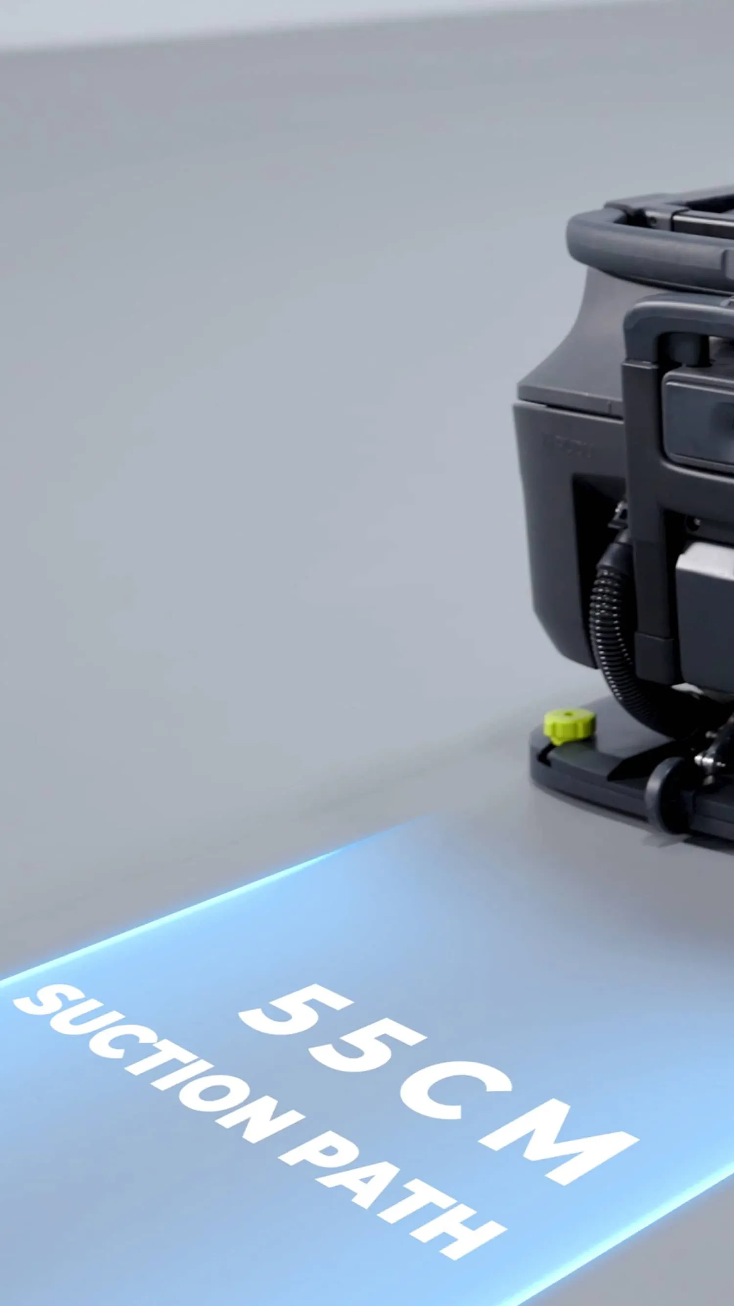 55 cm ekstra geniş emiş yolu: Geleneksel ticari elektrikli süpürgelere kıyasla her geçişte iki kat daha fazla alan temizler, temizlik süresini büyük ölçüde azaltır ve verimliliği artırır.